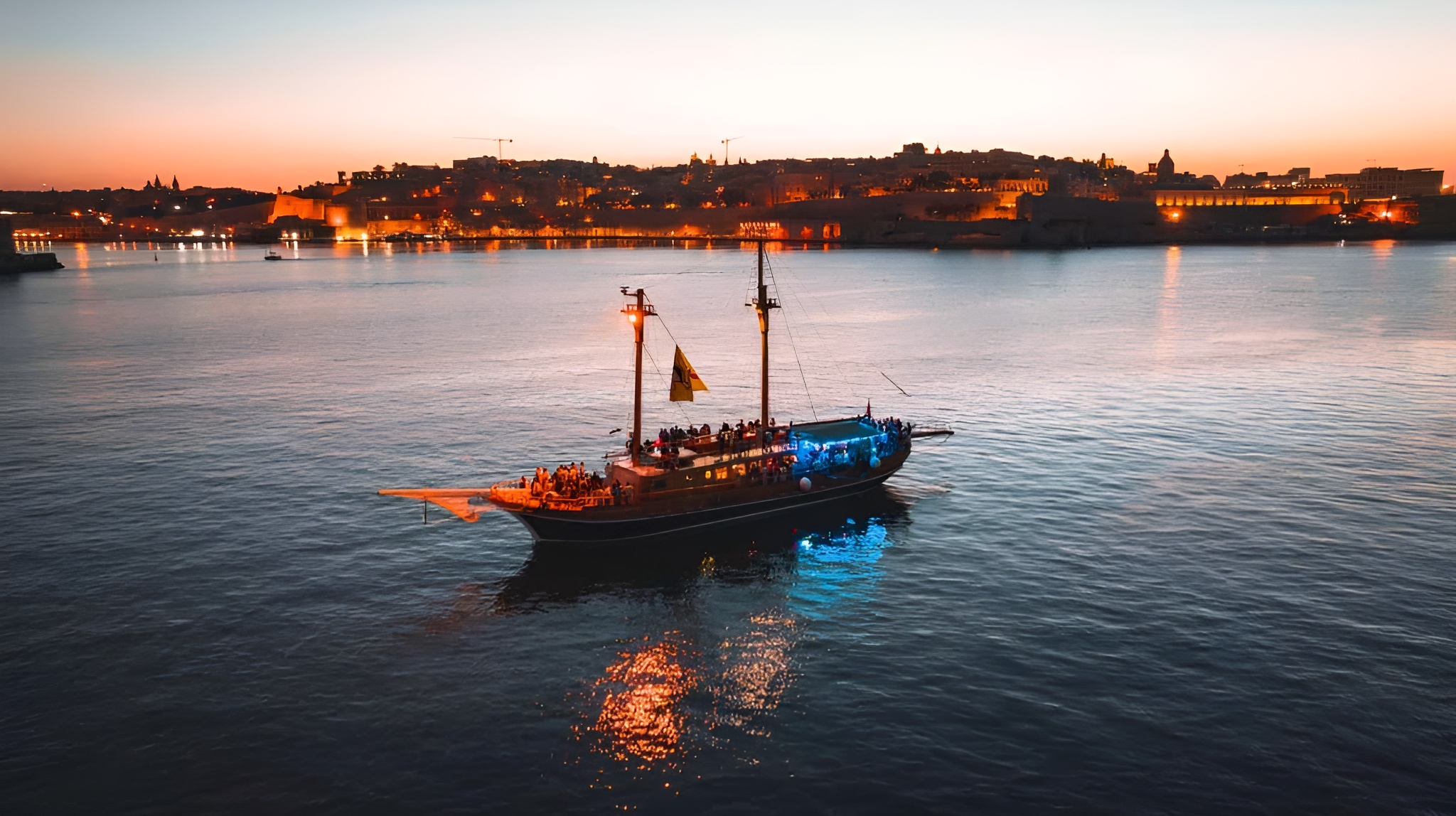 The boat departs from Sliema and cruises towards the setting sun. You will be sailing along the Maltese Coast as night falls and the music gets louder.